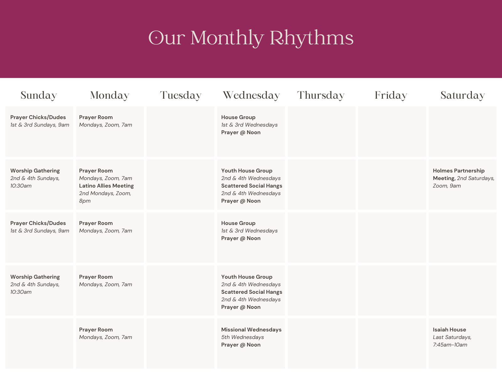 Instead of a weekly Sunday service, we meet together as a whole church family for worship gatherings twice a month, every 2nd & 4th Sunday. Learn more about our other rhythms and ways of staying connected throughout the month here.